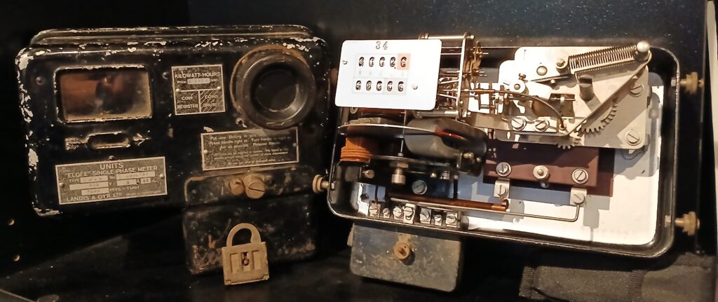 This kilowatt hour meter is a long way back from today’s smart meters. It’s a shilling in the slot meter. The householder drops a shilling in the slot behind the handle presses and turns it. A shilling’s worth of power is dialled up on the readout and the shilling drops into the locked box at the bottom of the meter.